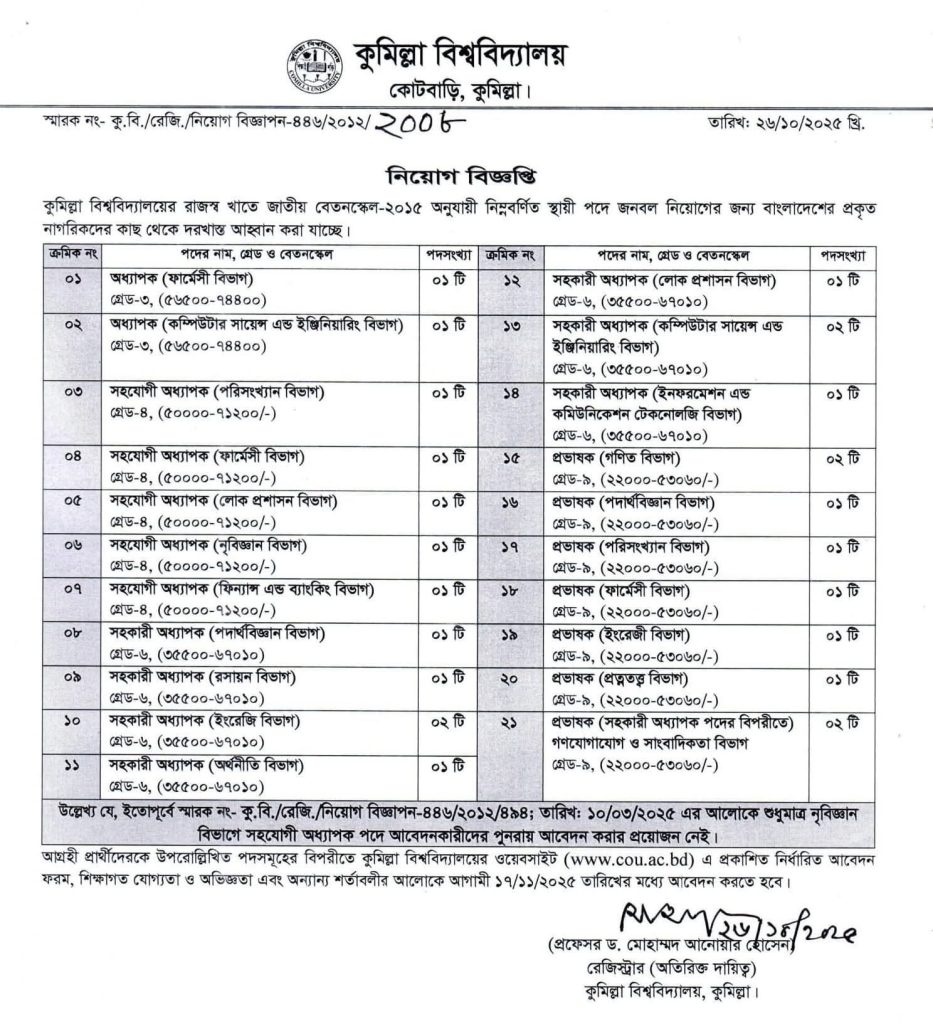 কুমিল্লা বিশ্ববিদ্যালয় নিয়োগটির সকল পদের জন্য লিখিত ও মৌখিক পরীক্ষা গ্রহণ করা হবে এবং পরীক্ষা গ্রহণের স্থান, তারিখ ও সময়সূচী যথা সময়ে প্রার্থীদের মােবাইলে SMS করে জানানাে হবে। এছাড়াও কুমিল্লা বিশ্ববিদ্যালয় (কুবি) নিয়োগটির সকল আপডেট তথ্য তাদের অফিশিয়াল ওয়েবসাইট www.cou.ac.bd এ প্রকাশ করা হবে।