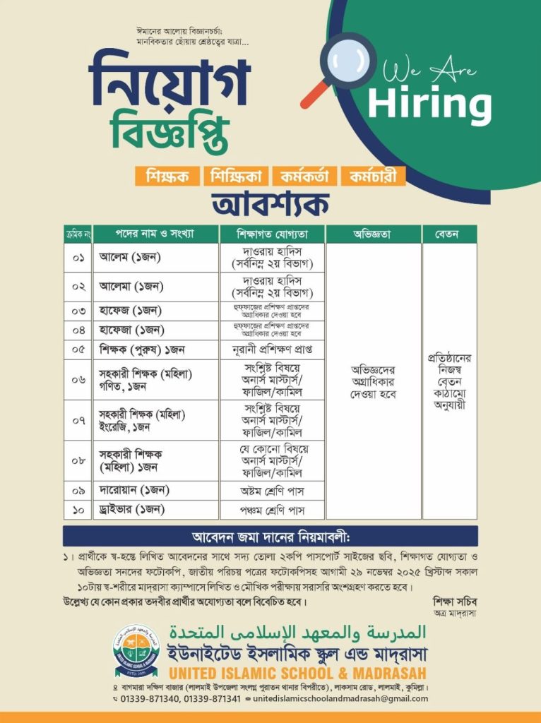 ‎সিভি ইমেইল করে নিয়োগ পরিক্ষায় অংশগ্রহণ নিশ্চিত করুন- unitedislamicschoolandmadrasah@gmail.com